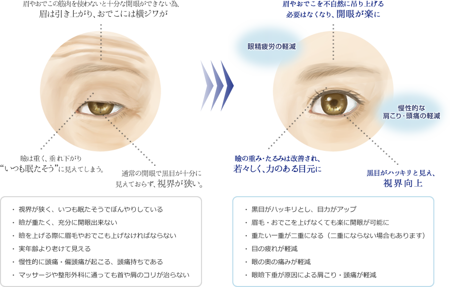 このような状態が長期間続くことで、視界や見た目の問題だけでなく、上瞼のくぼみ・頭痛・肩こり・眼精疲労などを引き起こし、顔の上半分の老化をも加速させてしまいます。