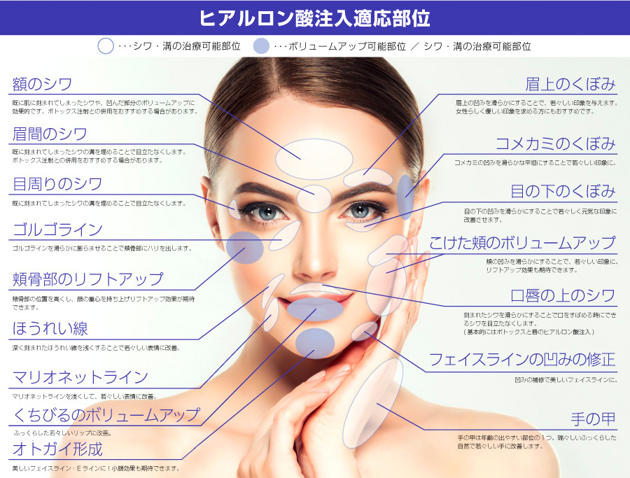 - ヒアルロン酸注射後に、まれに皮下出血が出ることがありますが、2-3週間後に消失します。皮膚の薄い部分に浅くヒアルロン酸を注入された場合には凸凹感が生じることがあります。きわめてまれに、誤ってヒアルロン酸が血管内にうたれると、皮膚壊死や失明のリスクがあります。しかし、当院の医師はヒアルロン酸注射手技ワークショップを何度も受講し、訓練を受けた医師のみがヒアルロン酸注射を行うので、血管への誤注入はかつてありません。そして、万が一そのようなことが起こっても、副作用による被害を最小限にするために、ヒアルロン酸を融かすことができる薬剤を常に備えつけて、リスクに対応できる体制を整えています。